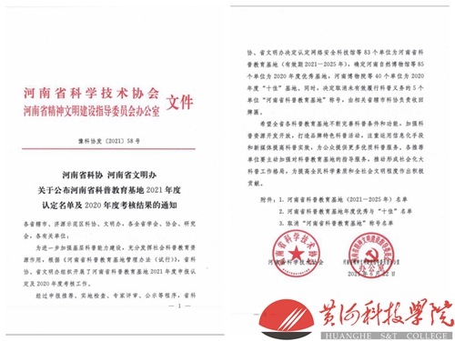 近日,河南省科协、河南省文明办公布河南省科普教育基地2020年度考核结果,我校智慧逐梦体验馆获评为2020年度优秀科普教育基地、十佳·教育科研类科普教育基地。